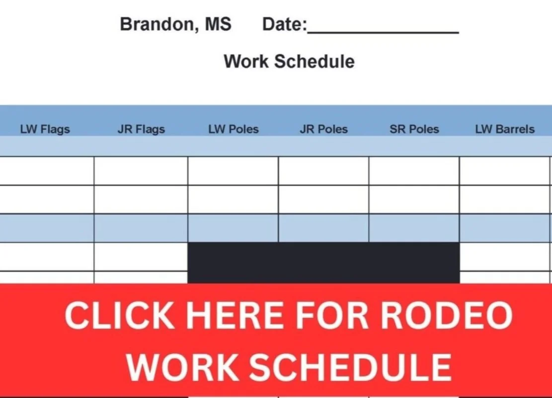 WORK SCHEDULE sign-up sheet is posted outside the office door at 8:00 AM on Saturday morning for the next months rodeo. The text in line will open on the MONDAY of the week of the rodeo at 6:00 A.M. for any remaining spots not filled at the previous rodeo. You will text into Shay Pinter at 601-416-4873 with your name and the event you want to work. When texting in, you are signing up for both Saturday and Sunday’s rodeo unless you specify to her one day only. Remember to read above guidelines…you will be fined and not earn state points if you do not show up for what you sign up for!